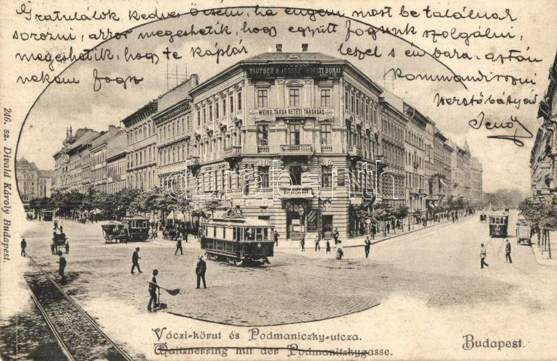 Budapest VI. Váci körút, Podmaniczky utca, Teutsch B. József üzlete, Weiss és Társa betéti társaság, villamosok, Dival Károly 246. sz. (EK)
