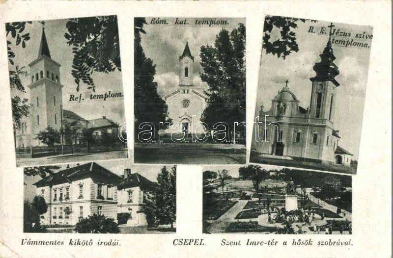 Budapest XXI. Csepel; templomok, vámmentes kikötő irodái, Szent Imre tér, Hősök szobra (EK)