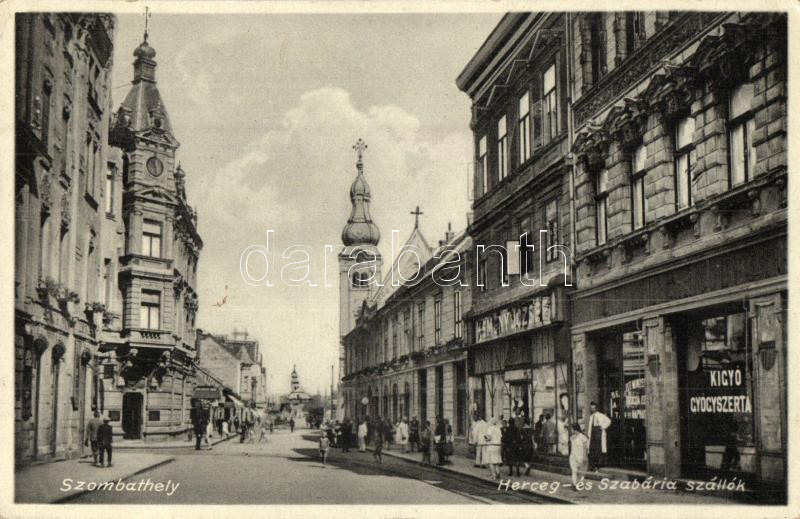 Szombathely, Herceg és Szabária szállók, utcakép, Kígyó gyógyszertár, Kemény József üzlete
