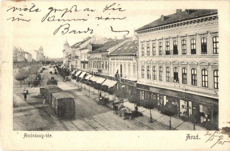 Arad, Andrássy tér, Andrényi Károly és fiai vaskereskedése, Schwarz Simon fiai és társa, Róth Testvérek, Schaffer Henrik üzletei, vagonok, Divald Károly 609. sz. / square, ironmongery, shops, wagons (EK)