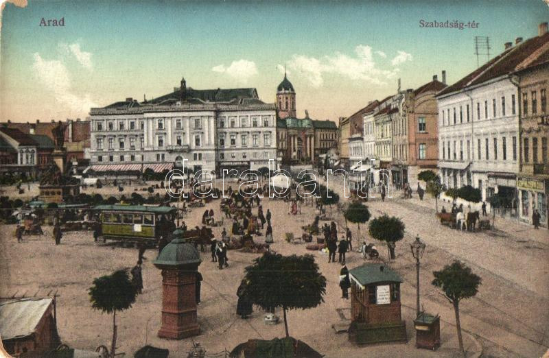 Arad, Szabadság tér, piac, villamos, autóbusz, Limbeck János és Fia, Moskovitz Zs. üzletei / square, market, autobus, tram, shops (kopott sarkak / worn corners)