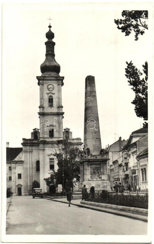 Kolozsvár, Cluj; Ferencz téri Milleniumi szobor, templom, automobil, ezüstáru üzlet / square, millenial monument, church, automobile, silverware store
