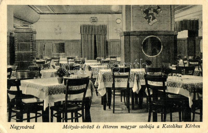 Nagyvárad, Oradea; Mátyás söröző és étterem, magyar szoba, Katolikus Kör, belső, Röckel Fotó, Kapucinus Rendház kiadása / Restaurant, Hungarian hall, Catholic Circle, interior (EK)