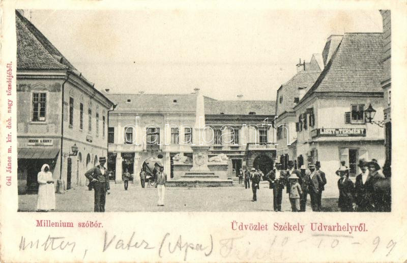 Székelyudvarhely, Odorheiu Secuiesc; Millenium szobor, liszt és termény kereskedés, Hodor Károly üzlete, kiadja Gál János / statue, shops (EK)