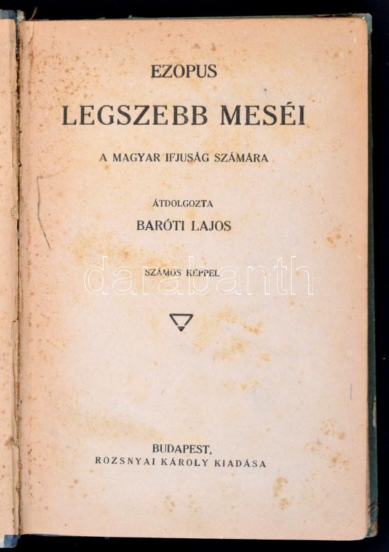 Baróti Lajos: Ezopus legszebb meséi. A magyar ifjúság számára. Bp., é.... https://www.darabanth.com/en/286-Online-auction/286.0/Books/Books-Other-rarities~44/Baroti-Lajos-Ezopus-legszebb-mesei-A-magyar-ifjusag-szamara-Bp-en-Rozsnyai-Karoly-K~II1498986