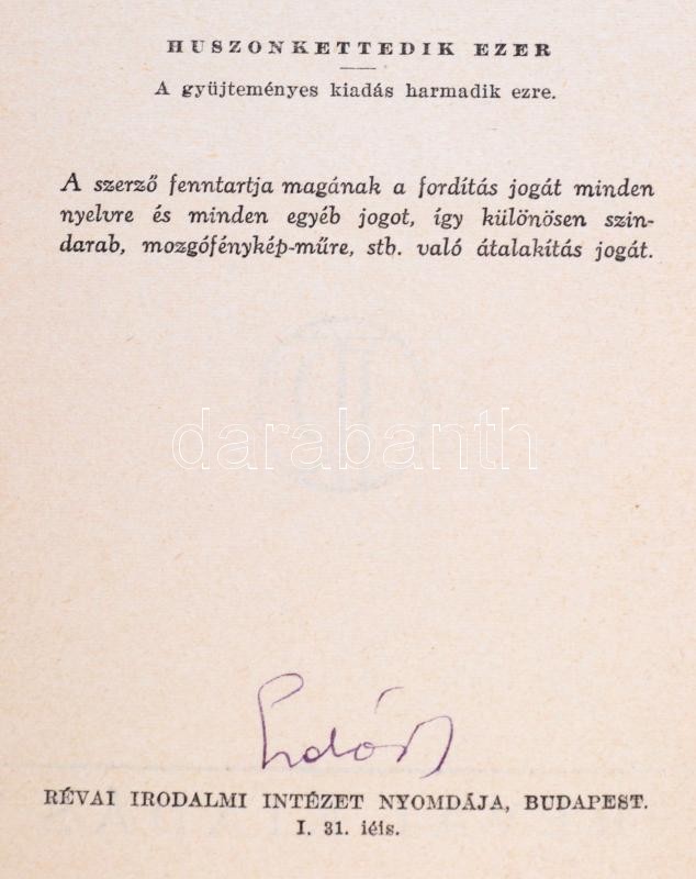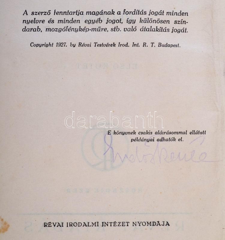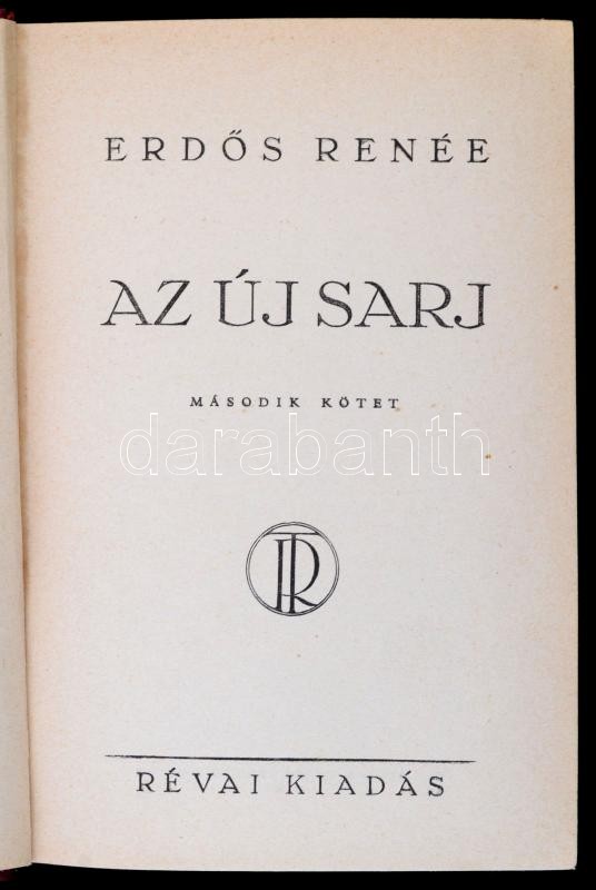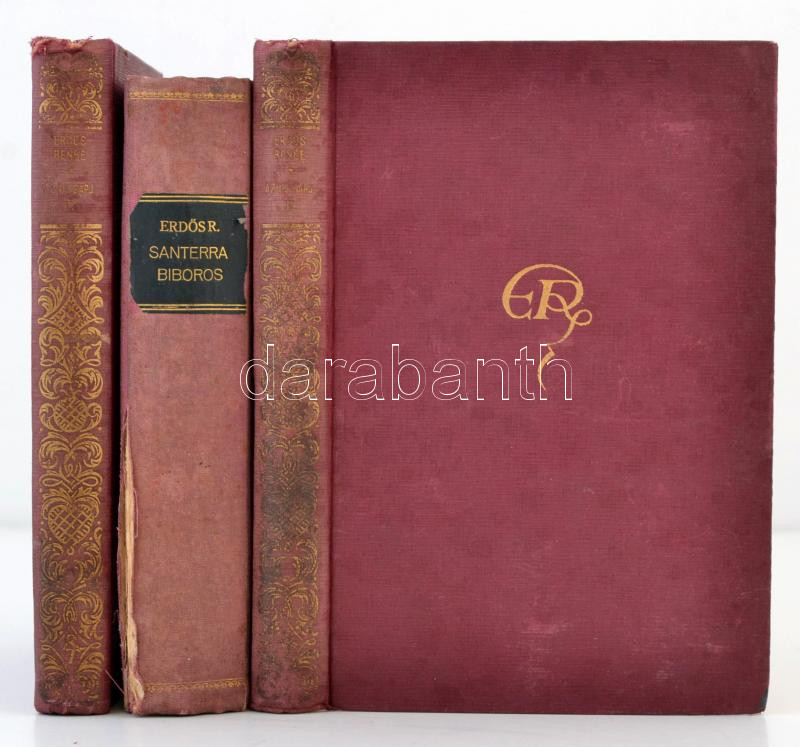 Erdős Renéé könyvek, 2 db; Az új sarj I-II. Bp., é.n., Révai. Kiadói aranyozott egészvászon kötés, kopottas borítóval. A szerző által aláírt. Santera Bíboros I-II. (Egybekötve). Bp., 1927, Révai. Átkötött félvászon kötés, kopottas borítóval, sérült gerinccel. A szerző által aláírt.