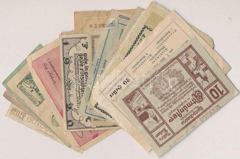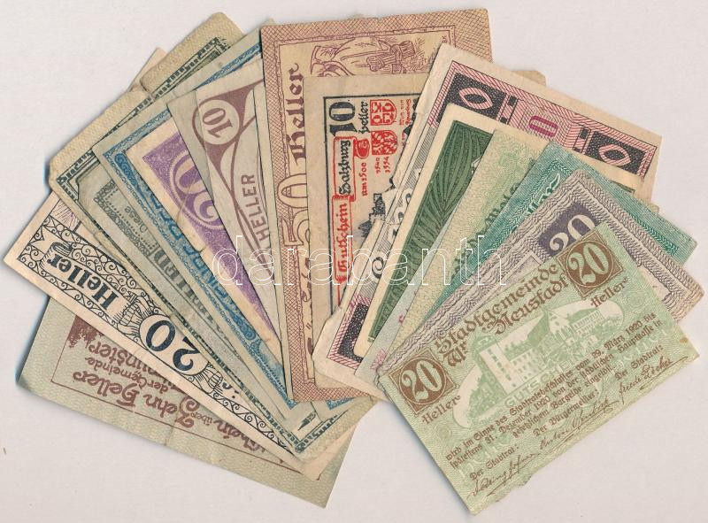 Ausztria 1920. 10-50h (20xklf) utalvány és szükségpénz, többek között Brunenthal, Wiener Neustadt, Pernau, Salzburg, Neukirchen és Mauthausen T:II-III- Austria 1920. 10-50 Heller (20xdiff) vouchers and necessity notes, with notes from Brunenthal, Wiener Neustadt, Pernau, Salzburg, Neukirchen and Mauthausen C:XF-VG
