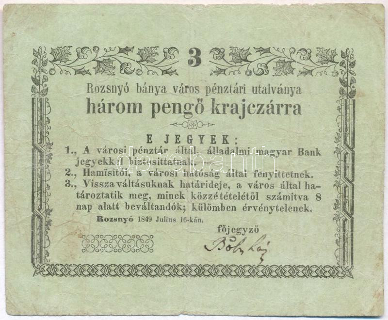Rozsnyó 1849. 3kr "Rozsnyó bánya város pénztári utalványa" T:III