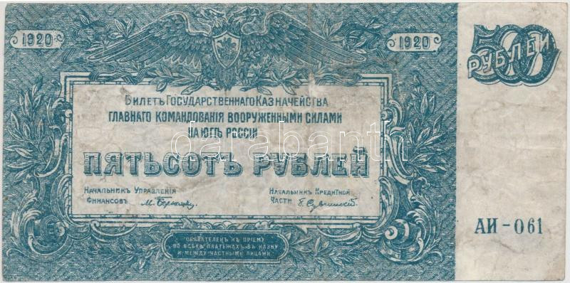 Orosz Polgárháború / Dél-Oroszország / Wrangel hadserege 1920. 500R T:... https://www.darabanth.com/en/286-Online-auction/286.0/Numismatics/Worldwide-banknotes~400011/Orosz-Polgarhaboru-Del-Oroszorszag-Wrangel-hadserege-1920-500R-TIII-fo-ly--Russian-Ci~II1495957