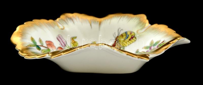 Herendi Viktória mintás leveles tálka, kézzel festett, jelzett, kopásnyomokkal, 15,5×8×4 cm
