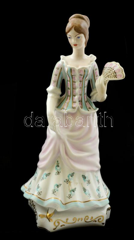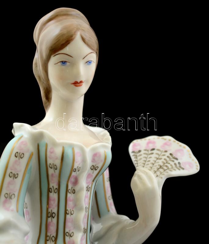 Hollóházi legyezős hölgy, kézzel festett, jelzett, hibátlan, festék hibával, m:26 cm