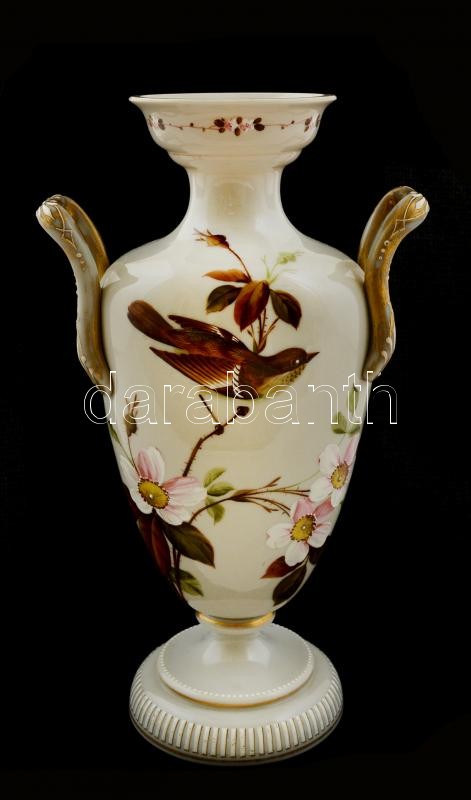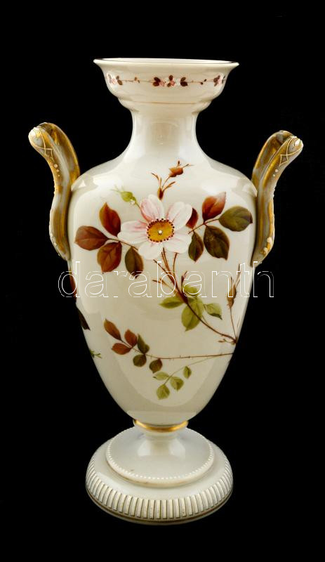 Kézzel festett virág mintás füles váza, jelzés nélkül, kopott, m:27 cm