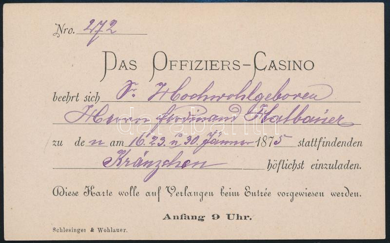 1875 Meghívó a Tiszti Kaszinó összejövetelére, Halbauer Nándor (1824-1900) dán konzul, városi képviselő, a Halbauer és Kölber-féle Gőztésztagyár társtulajdonosa, gyarmatáru nagykereskedő részére