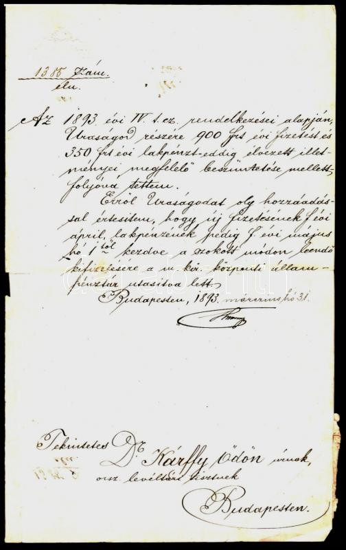 1893 Dr. Kárffy Ödön történész, levéltáros fizetésemelési értesítése, ...