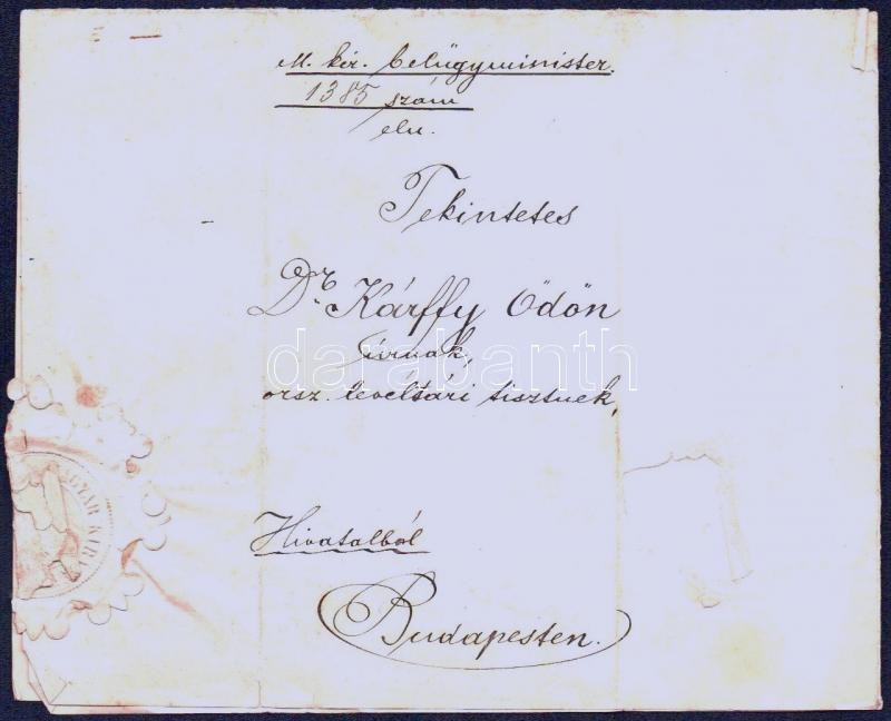 1893 Dr. Kárffy Ödön történész, levéltáros fizetésemelési értesítése, Hieronymi Károlynak (1836-1911) az első Wekerle-kormány belügyminiszterének (1892-1895) aláírásával, szárazbélyeggel, okmánybélyeggel, kisebb sérüléssel.