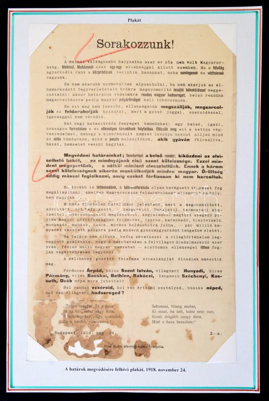 1918 Sorakozzunk! Az Őszirózsás forradalom alatt kiadott, a határok megvédésére, polgárőrség, hadsered megszervezésére felszólító plakát. 22x34 cm Lyukkal. Ritka!