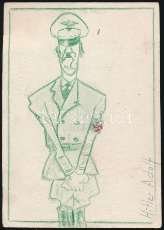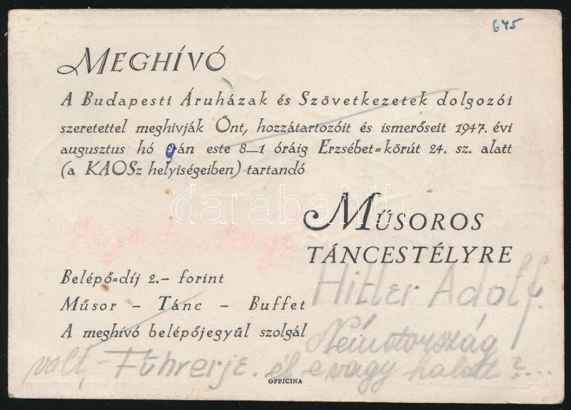 1947 Hitler Adolfot ábrázoló gúnyrajz, táncest meghívón rajta kézzel írt felirat Argentín tangó, Németország volt Führerje él e vagy halott? (célzás egy argentin menekülésre)