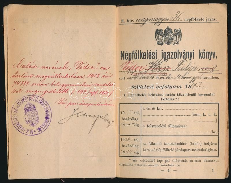 1908-1910 M. Kir. Ung megyei 36. népfölkelő járás által kiállított népfölkelési igazolványi könyv