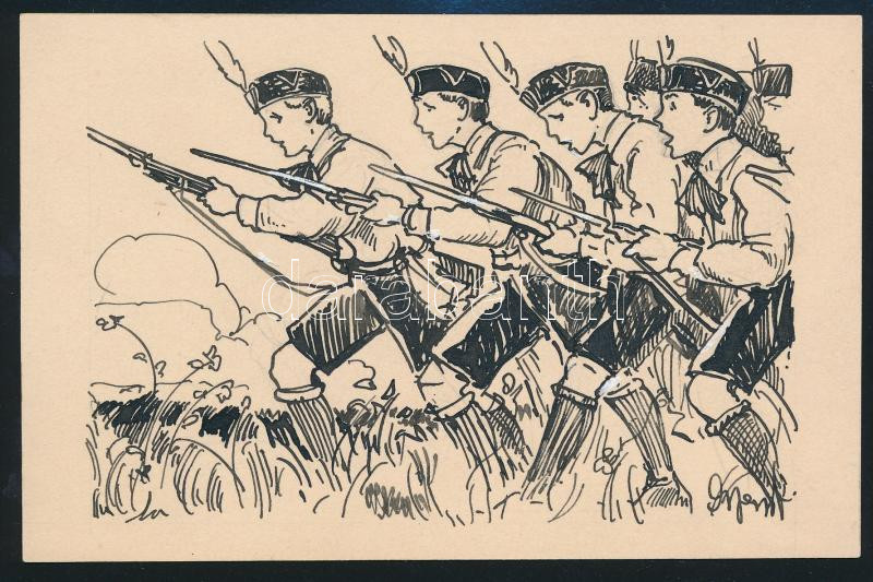 cca 1926 Puskával gyakorlatozó Leventék Győrffy György tusrajza. 14x10 cm