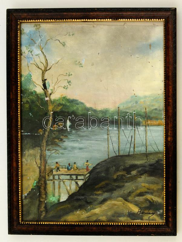 Berény jelzéssel: Fürdözők a stégen. Olaj, vászon-karton, üvegezett ke...