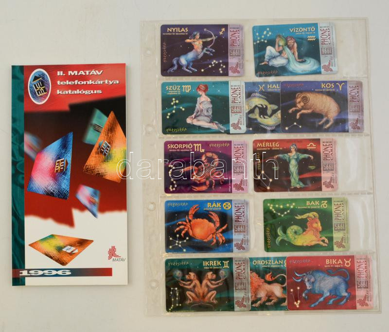 12 db különféle horoszkópmotívumos telefonkártya, használt, berakóban + II: MATÁV telefonkártya katalógus 1996