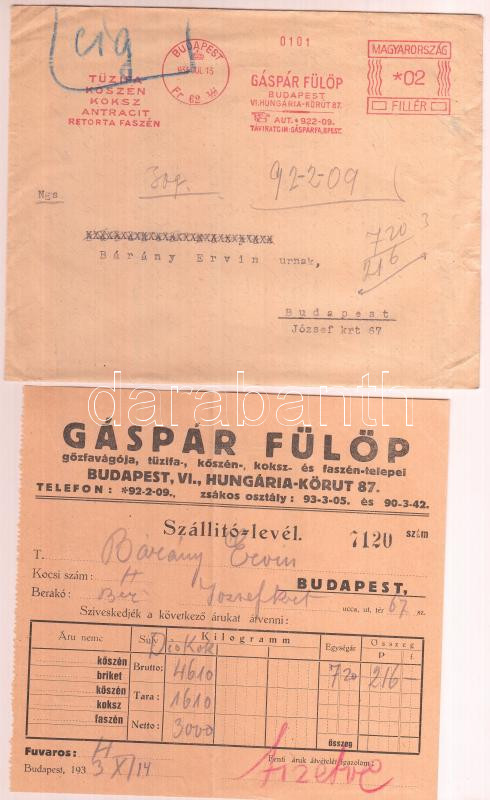 1933 Bp., Gáspár Fülöp Gőzfavágója, Tűzifa stb. díszes fejléces számla, szállítólevél, boríték