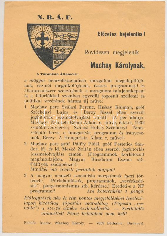 cca 1936 NRÁF. Nemzeti Rendi Államfront nevű Turánista, szélsőjobboldali szervezet röplapja