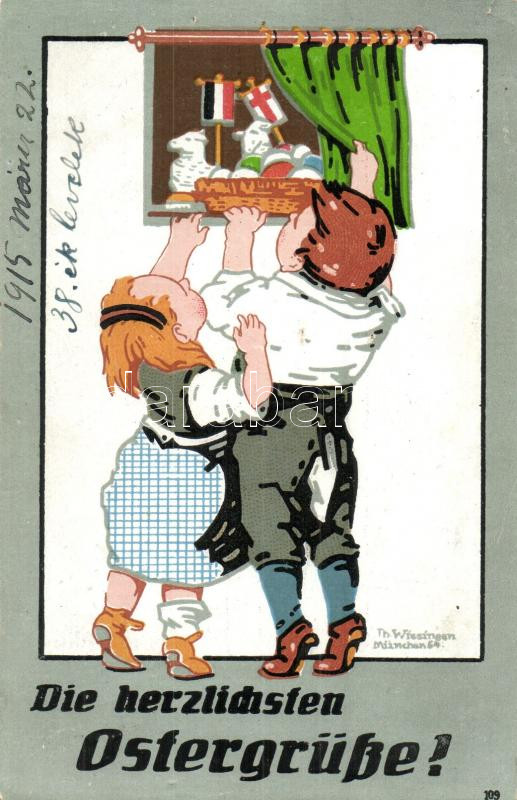 'Die herzlichsten Ostergrüße!' / Easter greeting card, children, toys, flags, litho s: Th. Wiesinger (Rb)