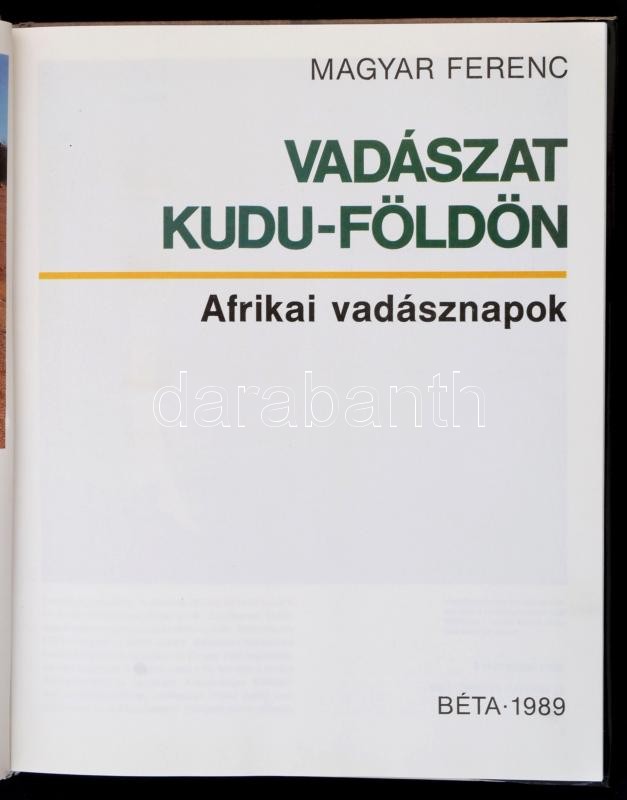 https://www.darabanth.com/en/287-Online-auction/287.0/Books/Books-Hunting~100035/Magyar-Ferenc-Vadaszat-Kudu-foldon-Afrikai-vadasznapok-Bp-1989-Beta-Kartonalt-papirko~II1506220
