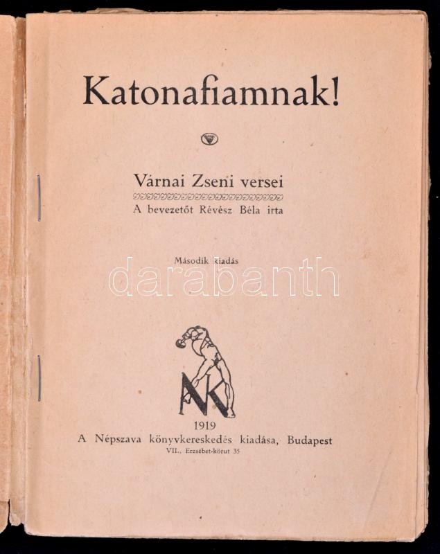 Várnai Zseni: Katonafiamnak. A bevezetőt írta Révész Béla. Bp., 1919, ... https://www.darabanth.com/en/287-Online-auction/287.0/Books/Books-Military~100032/Varnai-Zseni-Katonafiamnak-A-bevezetot-irta-Revesz-Bela-Bp-1919-Nepszava-konyvkeresked~II1504255