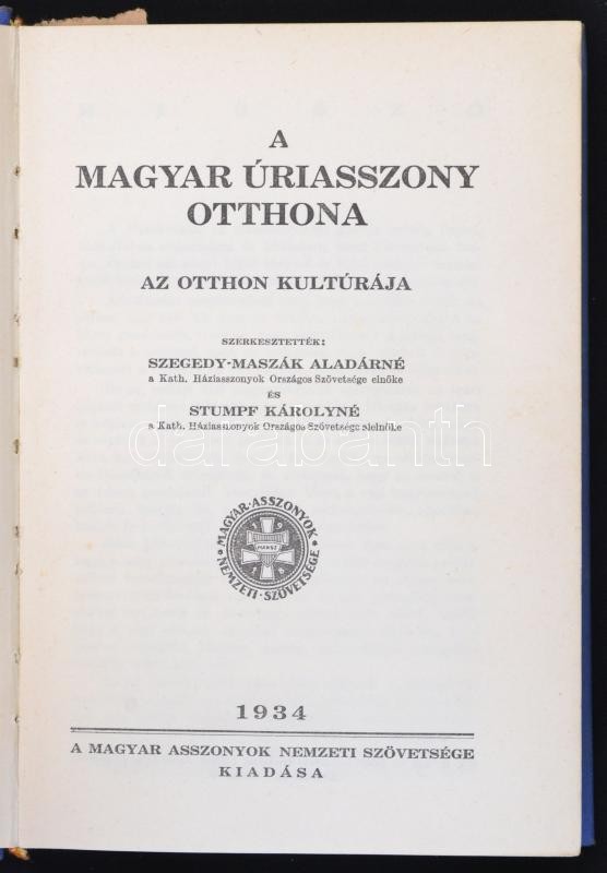 Description: A Magyar Úriasszony Otthona. Szerk.: Szegedy- Maszák Aladárné, Stumpf Károlyné. (Budapest), 1934, A Magyar Asszonyok 4. Könyve, A Magyar Asszonyok Nemzeti Szövetsége kiadása. Kiadói egészvászon kötésben.