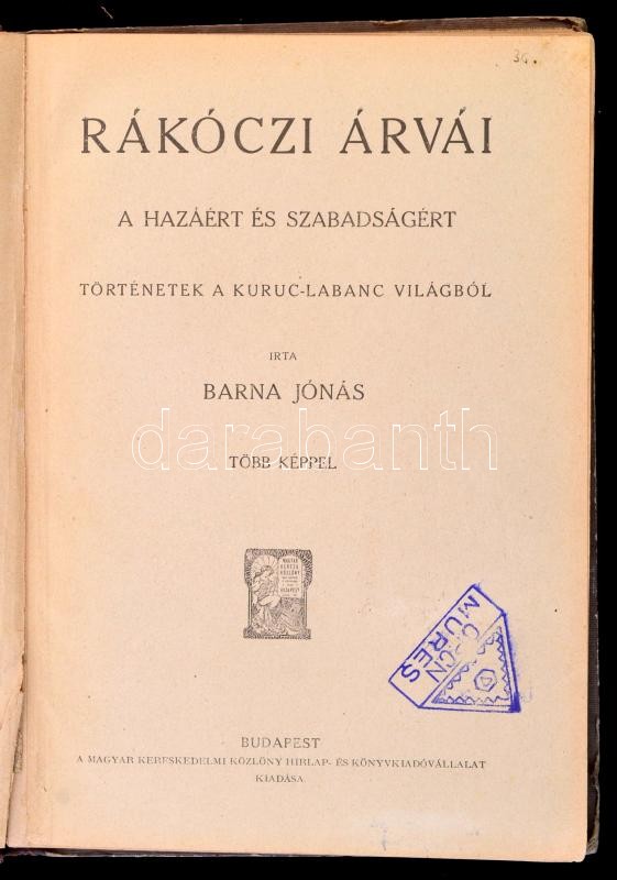 Description: Barna Jónás: Rákóczi árvái. A hazáért és a szabadságért. Történetek a kuruc-labanc világból. Bp., é.n., Magyar Kereskedelmi Közlöny Hirlap- és Könyvkiadóvállalat. Kiadói illusztrált félvászon kötés, kopottas és kissé foltos borítóval, kissé laza fűzéssel.