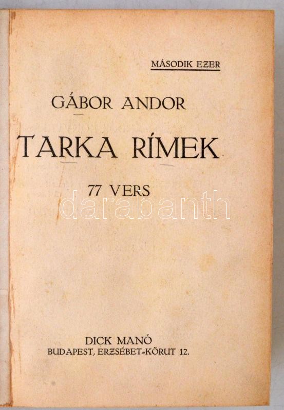 https://www.darabanth.com/en/287-Online-auction/287.0/Books/Books-Other~100044/Gabor-Andor-Tarka-rimek-vers-77-vers-Budapest-1913-Dick-Mano-Az-eredeti-borito-megtartC3~II1390163
