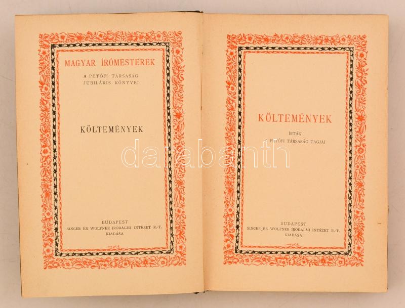 Magyar Írómesterek. A Petőfi Társaság Jubiláris Könyvei, 10 kötet (Költemények, Elbeszélések, Tanulmányok, Csathó Kálmán, Lampérth Géza, Farkas Pál, Surányi Miklós, Lázár István, Pekár Gyula, Heczeg Ferenc.) Budapest, 1926, Singer és Wolfner. Kiadói aranyozott félbőr kötésben. Néhol kopottas, egy kötet gerince sérült.