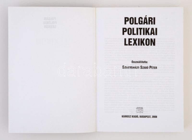 Polgári politikai lexikon. Szerk. Szentmihályi Szabó Péter. Budapest, 2008, Kairosz Kiadó. Kiadói papírkötés. Jó állapotban.