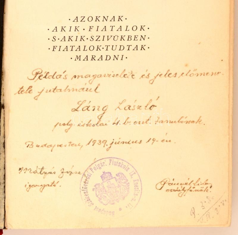 Description: Szentgyörgyi Sándor: Vihar Buda fölött. Horváth Jenő eredeti rajzaival. Budapest, é.n., Könyvbarátok Kis Könyve. Kiadói egészvászon kötés, kopottas, firkált borítóval, kicsit sérült gerinccel, a címlapon ajándékozási sorokkal és intézményi bélyegzővel.