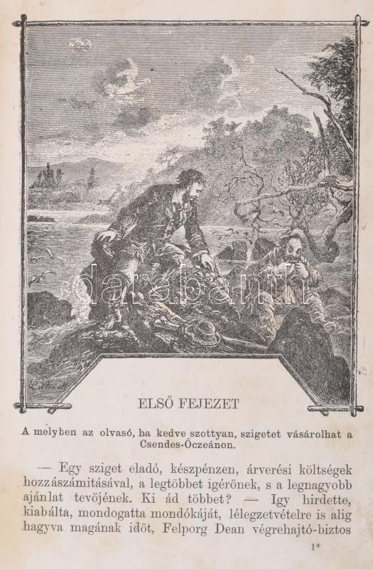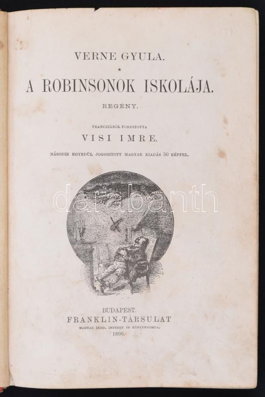 Verne Gyula: A Robinsonok iskolája. FordÃtotta Visi Imre. Bp., 1896, Franklin-Társulat. Második kiadás. Kiadói illusztrált, aranyozott, festett egészvászon kötés, egész oldalas fekete-fehér illusztrációkkal, némileg foltos, kissé kopottas borÃtóval, a gerince javÃtott.