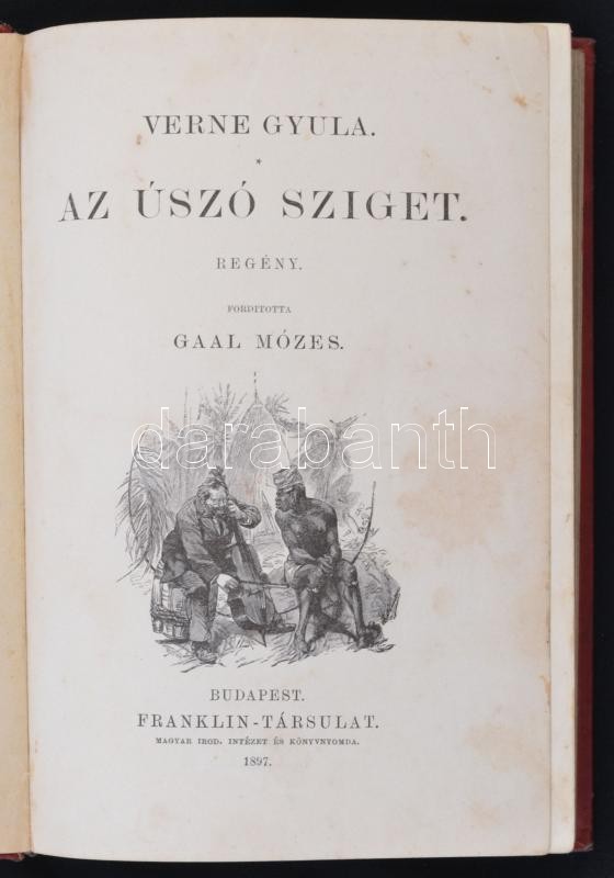 Verne Gyula: Az úszó sziget. Fordította Gaal Mózes. Budapest, 1897, Franklin-Társulat, 474+6 p. Kiadói illusztrált, festett, aranyozott egészvászon sorozatkötésben, egészoldalas fekete-fehér illusztrációkkal, kissé kopottas, foltos borítóval.