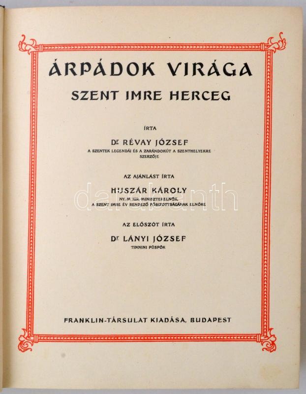 Dr. Révay József: Árpádok virága. Szent Imre herceg. Az ajánlást írta:... https://www.darabanth.com/en/287-Online-auction/287.0/Books/Books-Religion~100040/Dr-Revay-Jozsef-Arpadok-viraga-Szent-Imre-herceg-Az-ajanlast-irta-Huszar-Karoly-Az-e~II1381975