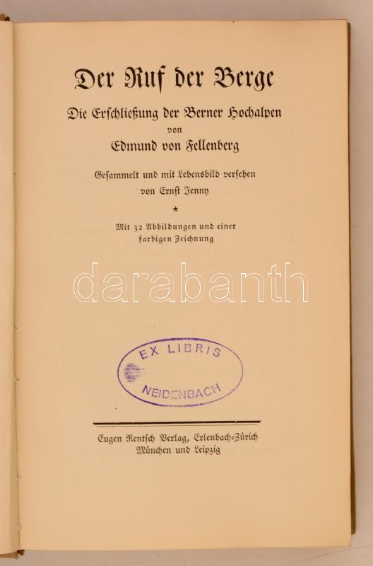 Fellenberg, Edmund von: Der Ruf der Berge. Die Erschließung der Berner Hochalpen. München - Lepizig, 1925, Eugen Rentsch Verlag. Vászonkötésben, jó állapotban.