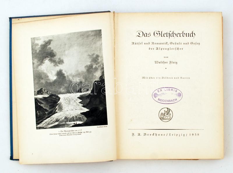 Description: Flaig, Walther: Das Gletscherbuch. Rätsel und Romantik, Gestalt und Gesetz der Alpengletscher. Leipzig, 1938, F. A. Brockhaus. Kicsit kopott gerincű vászonkötésben, egyébként jó állapotban.