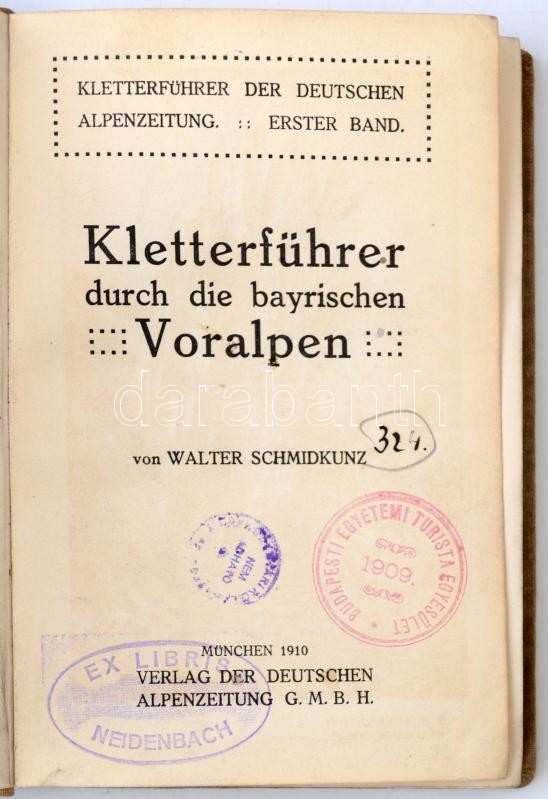 Schmidkunz, Walter: Kletterführer durch die Voralpen. München, 1916, Verlag der Deutschen Alpenzeitung GmbH (Kletterführer der Deutschen Alpenzeitung 1.). Díszes, kicsit kopott vászonkötésben, jó állapotban.