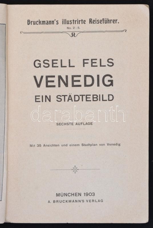 Gsell Fels Venedig, ein städtebild. Bruckmann's illustrirte Reiseführer. München, 1903, A. Bruckmann's Verlag. Hatodik kiadás. Kiadói papÃrkötés, kissé viseltes, szakadozott borÃtóval, fekete-fehér fotókkal, és egy térképpel illusztrálva, német nyelven./ Paperbinding, in poor condition, with a damaged cover, in German language.