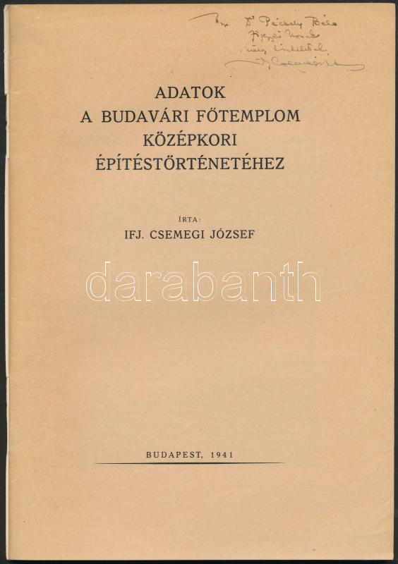 Ifj. Csemegi József: Adatok a Budavári Főtemplom középkori építéstörté... https://www.darabanth.com/en/287-Online-auction/287.0/Books/Books-Travelling-Local-History~100028/Ifj-Csemegi-Jozsef-Adatok-a-Budavari-Fotemplom-kozepkori-epitestortenetehez-Bp-1941~II1465062
