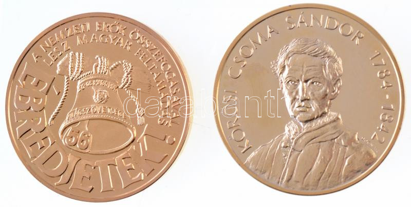 Description: Bognár György (1944-) 1992. "Magyarok III. Világkongresszusa / Kőrösi Csoma Sándor" aranyozott fém emlékérem tokban (42,5mm) + 1993. "56-os Magyarok Világtalálkozója / A nemzeti erők összefogásával lesz magyar feltámadás - Ébredjetek" aranyozott fém emlékérem (42,5mm) T:1-(PP),BU