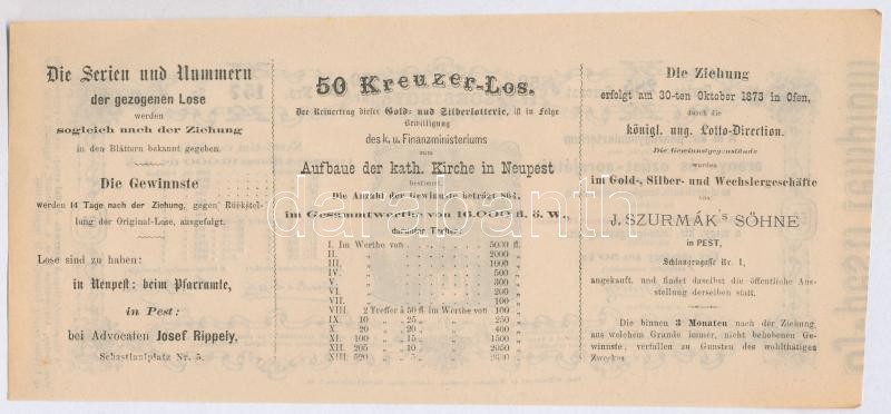 Description: Budapest / Pest 1873. "A Magyar Királyi Pénzügyminisztérium arany- és ezüst sorsjátéka az Újpesti Katolikus Templom felépítésének javára" 50kr értékben T:I,I-