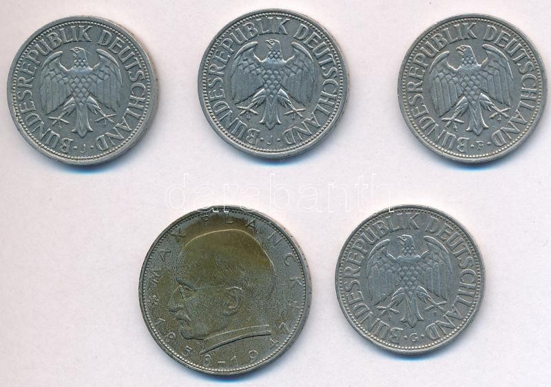 NSZK 1950J 1M Cu-Ni + 1954G 1M Cu-Ni (Ritka év!)+ 1957F 1M Cu-Ni + 1959J 1M Cu-Ni + 1957J 2M Cu-Ni T:2 kis ph., patina
