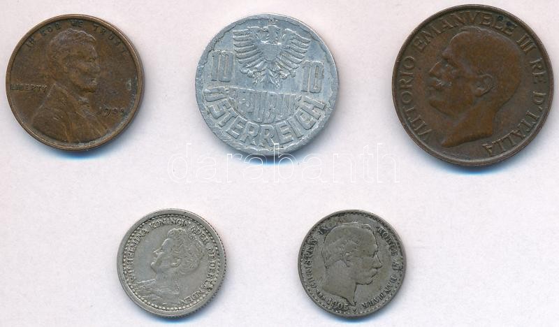 Vegyes: Dánia 1905. 10o Ag "IX. Keresztély" + Amerikai Egyesült Államok 1c Br "Lincoln" + Hollandia 1918. 10c Ag "I. Vilma" + Olaszország 1924R 10c Cu "II. Viktor Emánuel" + Ausztria 1964. 10gr Al T:2,2- kis patina, kis ph. Mixed: Denmark 1905. 10 Ore Ag "Christian IX" + USA 1 Cent Br "Lincoln" + Netherlands 1918. 10 Cents Ag "Wilhelmina I" + Italy 1924R 10 Centesimi Cu "Vittorio Emanuele II" + Austria 1964. 10 Groschen Al C:XF,VF small patina, small edge error Krause KM#795.2, KM#132, KM#145, KM#60, KM#2878