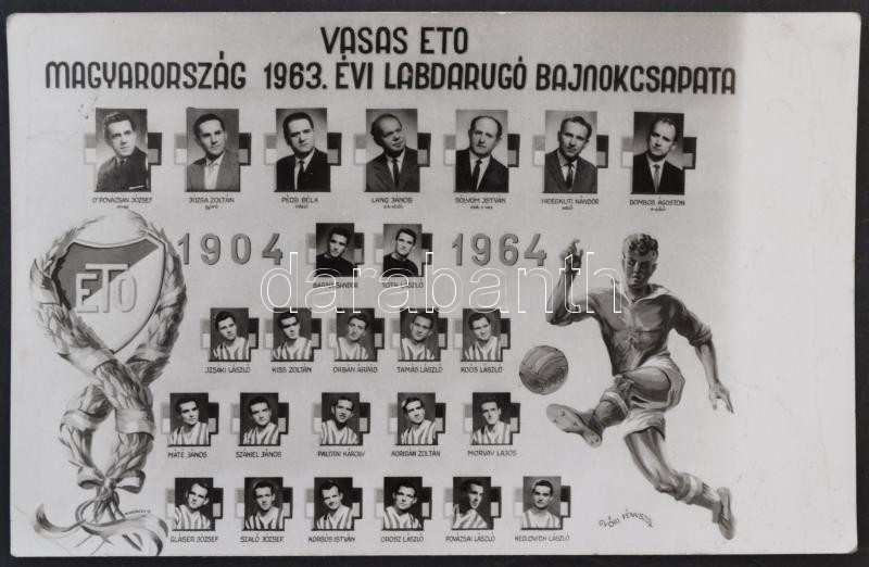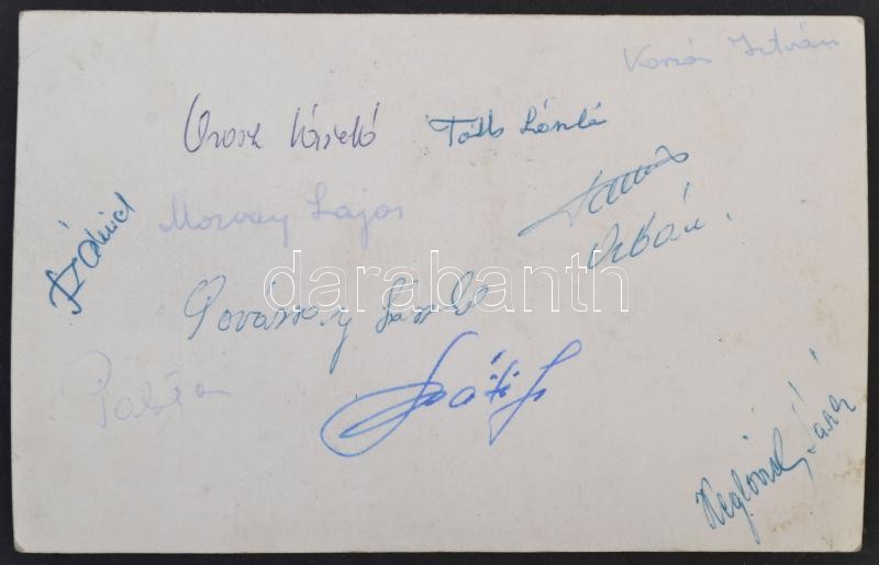 1963 Győri Vasas ETO 1963. évi labdarúgó bajnokcsapatának tablófotója, a hátoldalán a csapat tagjainak aláírásaival (Korsós István, Orosz László, Tóth László, Povázsai László, Morvay Lajos, Orbán Árpád, Keglovich László...stb.), 14x9 cm.
