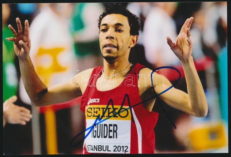 Abdalaati Iguider (1987-) olimpiai bronzérmes, világbajnok marokkói középtávfutó aláírása egy őt ábrázoló fotón, 10x15 cm./ autograph signature